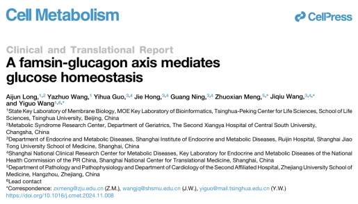 近日,中南大学湘雅二医院老年医学科特聘副研究员隆艾君作为独立一作的研究论文在代谢领域国际顶级期刊《Cell Metabolism》上发表,该研究论文题为“肠促生存素-胰高血糖素轴调控葡萄糖稳态”(A Famsin-Glucagon Axis Mediates Glucose Homeostasis),IF:31.2。这项研究首次揭示了肠促生存素(Famsin)促进胰高血糖素分泌及维持血糖稳态的关键作用。