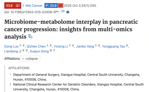 近日,中南大学湘雅医院胰腺外科龚学军教授、李宜雄教授团队在国际权威期刊《Molecular Cancer(分子癌症)》(IF=33.9)在线发表了题为《Microbiome-metabolome interplay in pancreatic cancer progression: insights from multi-omics analysis(微生物组-代谢组在胰腺癌进展中的相互作用:多组学分析视角)》的研究成果,标志着团队在多组学分析揭示胰腺癌进展中微生物组-代谢组相互作用机制研究方面取得重大突破。本研究首次系统性地整合16S测序和非靶向代谢组学数据,构建了胰腺癌中微生物组-代谢组相互作用网络,揭示了假单胞菌属通过调控氨基酸代谢参与胰腺癌进展的新机制,发现了具有预后预测价值的微生物标志物,为个体化治疗提供新思路,为开发基于微生物组的代谢干预治疗策略提供了理论基础,有望在未来改善胰腺癌患者的预后。