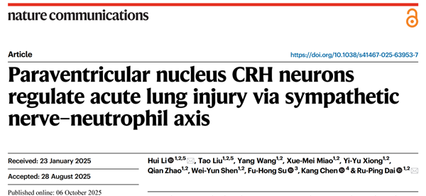 戴茹萍、李卉团队在Nature子刊发文 揭示脑-肺轴主动调控急性肺损伤新机制