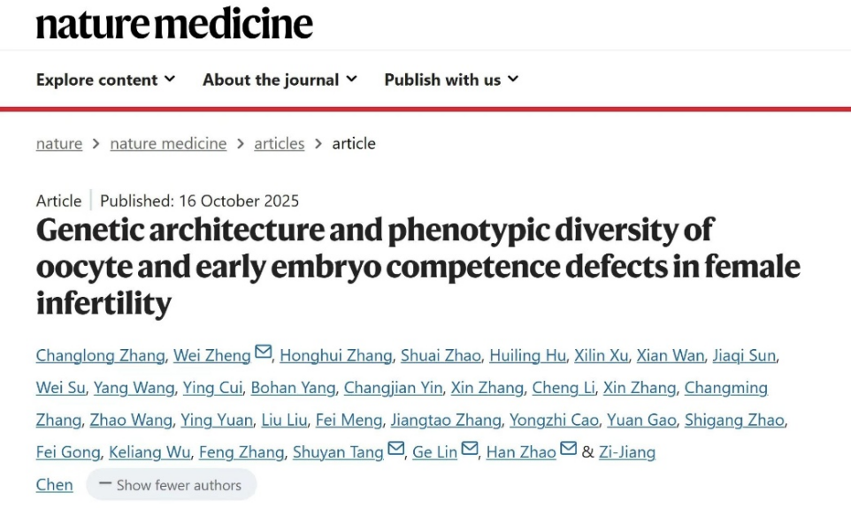 近日,中南大学湘雅基础医学院林戈研究员与山东大学陈子江院士、赵涵教授、中南大学生命科学学院郑伟副教授和上海交通大学医学院唐淑妍副研究员团队合作,在Nature Medicine(最新五年影响因子:52.4)期刊发表题为“Genetic architecture and phenotypic diversity of oocyte and early embryo competence defects in female infertility”的研究论文。该研究基于大规模专病队列,率先构建了卵子及胚胎发育潜能缺陷(OECD)的六亚型分型体系,并绘制了首张亚型特异性遗传图谱,不仅为相关疾病的个体化检测路径设计提供了分子基础,也为临床精准分型诊断提供了关键的循证依据。