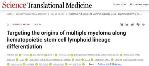 近日,中南大学肿瘤研究所周文课题组在国际知名学术期刊《科学转化医学》(Science Translational Medicine)(IF=16) 杂志在线发表最新成果“在造血干细胞淋巴系分化体系中揭示和靶向多发性骨髓瘤起始细胞”(Targeting the origins of multiple myeloma along hematopoietic stem cell lymphoid lineage differentiation)研究论文。