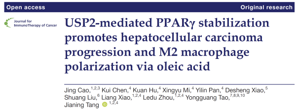 近日,中南大学湘雅医院肝脏外科周乐杜教授团队在国际知名期刊,国际癌症免疫治疗学会官方期刊《Journal for ImmunoTherapy of Cancer》(癌症免疫治疗杂志)(JCR Q1, IF=10.6)以论著形式在线发表了题为“USP2-mediated PPARγstabilization promotes hepatocellular carcinoma progression and M2 macrophage polarization via oleic acid(USP2介导的PPARγ稳定性通过油酸促进肝细胞癌进展和M2巨噬细胞极化)”的原创性研究。