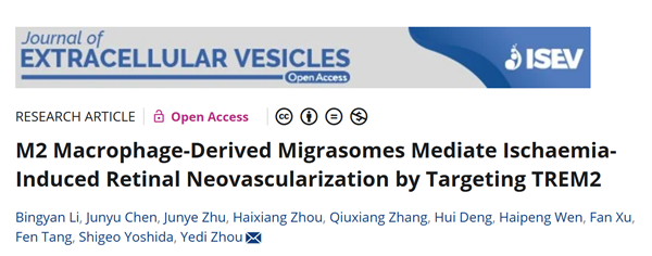 近日,湘雅二医院眼科周也荻课题组在国际细胞外囊泡学会(ISEV)官方期刊《细胞外囊泡杂志》(Journal of Extracellular Vesicles)(中科院一区,IF:14.5)上发表了题为《M2巨噬细胞来源的迁移体通过TREM2介导缺血诱导的视网膜新生血管生成》(M2 Macrophage-Derived Migrasomes Mediate Ischaemia-Induced Retinal Neovascularization by Targeting TREM2)的原创研究论文。该研究揭示了新型细胞器——“迁移体”在视网膜新生血管性疾病发生发展中的关键作用与潜在机制。