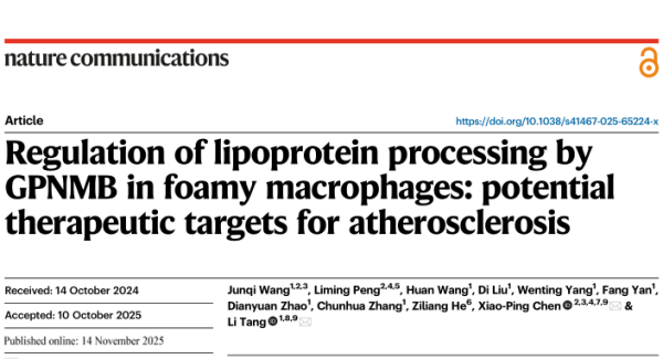 近日,中南大学湘雅医院临床药理研究所陈小平教授团队与国家蛋白质科学中心(北京)唐丽研究员团队在《Nature Communications(自然通讯)》上合作发表了题为“Regulation of Lipoprotein Processing by GPNMB in Foamy Macrophages: Potential Therapeutic Targets for Atherosclerosis(GPNMB对泡沫巨噬细胞中脂蛋白处理过程的调控:动脉粥样硬化潜在治疗靶点)”的研究性论文(IF:14.7)。该研究首次发现,表达于内质网、内体系统和溶酶体等细胞器膜上的糖蛋白非转移性黑色素瘤蛋白B(GPNMB)是巨噬细胞处理氧化型低密度脂蛋白(OxLDL)的关键蛋白,通过靶向脂质相关巨噬细胞中GPNMB的siRNA疗法在小鼠动脉粥样硬化模型中成功减少斑块负担并改善巨噬细胞脂代谢状态。这一发现为动脉粥样硬化的防治提供了全新靶点与策略。