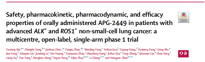 陈建华团队发表“口服给药APG-2449在晚期ALK+和ROS1+非小细胞肺癌患者中的安全性、药代动力学、药效学和疗效特性:一项多中心、开放标签、单臂I期试验”的临床研究成果