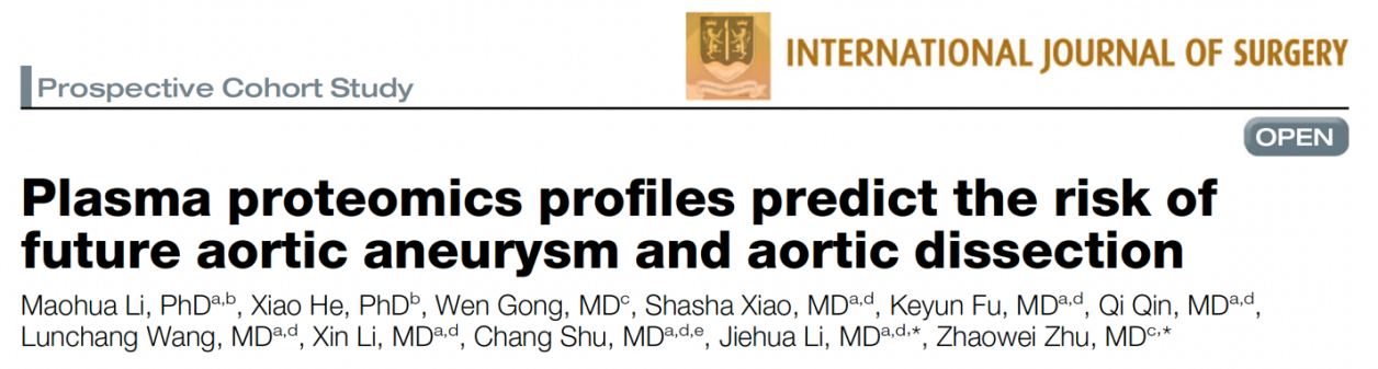 近日,中南大学湘雅二医院心内科朱兆伟、血管外科李杰华等在国际权威学术期刊《International journal of surgery》(IF=10.1)发表题为《Plasma proteomics profiles predict the risk of future aortic aneurysm and aortic dissection》的研究论文。