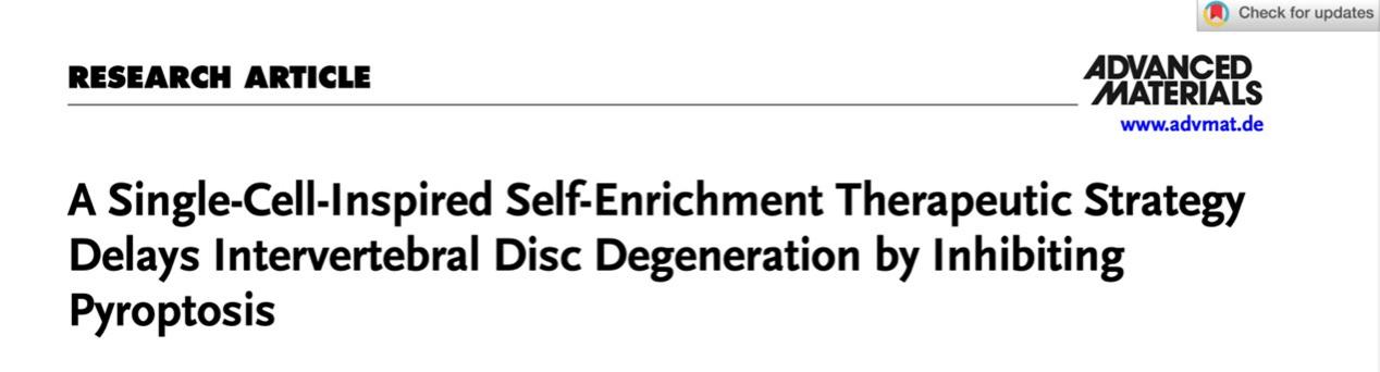 近日,中南大学湘雅三医院脊柱外科邓幼文教授在生物材料国际顶级学术期刊《先进材料》(Advanced Materials,中国科学院/JCR一区,Top期刊,影响因子:26.8)发表题为 “一种基于单细胞启发的自富集治疗策略通过抑制细胞焦亡来延缓椎间盘退变(A Single-Cell-Inspired Self-Enrichment Therapeutic Strategy Delays Intervertebral Disc Degeneration by Inhibiting Pyroptosis)”的原创研究论文。