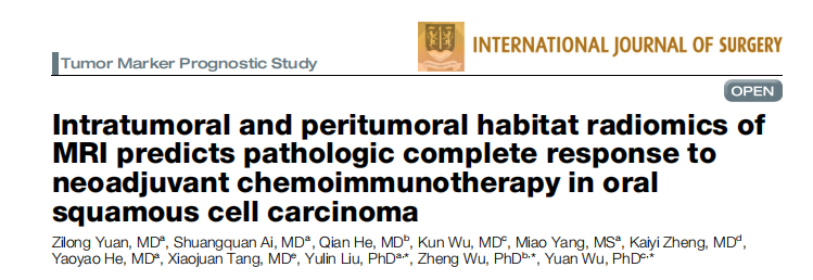 近日,由湘雅医学院附属肿瘤医院吴峥教授、何倩教授在《INTERNATIONAL JOURNAL OF SURGERY》(中科院二区,2024IF=10.3)发表了题为“Intratumoral and peritumoral habitat radiomics of MRI predicts pathologic complete response to neoadjuvant chemoimmunotherapy in oral squamous cell carcinoma(基于肿瘤内和肿瘤周围区域多序列 MRI的影像组学预测口腔鳞状细胞癌患者新辅助化疗免疫治疗的病理完全缓解)”的研究成果。