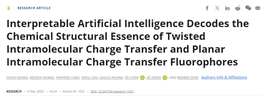 近日,中南大学湘雅药学院董界副教授、曾文彬教授团队在中科院一区TOP期刊《Research》(IF值:10.9)发表题为“Interpretable Artificial Intelligence Decodes the Chemical Structural Essence of Twisted Intramolecular Charge Transfer and Planar Intramolecular Charge Transfer Fluorophores”(利用可解释性的人工智能算法解构TICT(扭转分子内电荷转移)与PICT(平面分子内电荷转移)荧光团的化学结构本质)的原创论文。该研究利用人工智能的方法解决了仅靠分子结构以及化学直觉难以直接区分的TICT与PICT机制,并且首次提出基于人工智能指导的TICT与PICT分子的设计规则,显著的提升荧光探针的设计效率。基于该方法构建的高精度TICT与PICT预测模型的测试集AUC高达0.85,并且基于该模型团队系统揭示了影响电荷转移模式的五大关键因素,包括电子供体强度、电子受体强度、烷基环化、位阻效应与溶剂-溶质相互作用,其中电子供体、受体强度往往是分子设计中容易忽略的决定分子TICT与PICT机制的核心因素。值得注意的是,基于传统化学经验设计的分子相比于此人工智能指导的规则所设计的分子,预测的准确率从67.47%提升至90.96%,并且该结果也通过了量子化学计算-合成实验-细胞水平实验的闭环验证,确保该方法的实用性。这种新颖的方法策略有可能推动和解锁新一代的TICT与PICT荧光团,同时为基于该项机制的荧光探针、智能材料的设计与开发提供重要计算平台和理论依据。