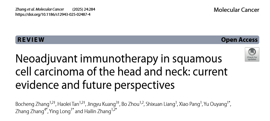 近日,湘雅医学院附属肿瘤医院张海林团队在《Molecular Cancer》(中科院一区,TOP期刊,2024IF=33.9)上发表了题为“Neoadjuvant immunotherapy in squamous cell carcinoma of the head and neck: current evidence and future perspectives(头颈部鳞状细胞癌的新辅助免疫治疗:当前证据与未来展望)”的综述文章。