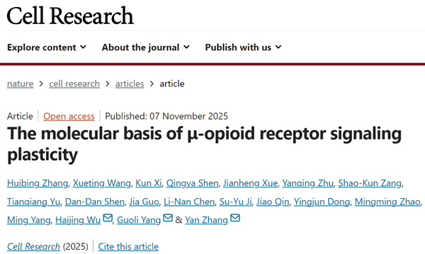 在Cell Research《细胞研究》(中科院一区Top期刊,IF=25.9)发表了题为“The molecular basis of μ-opioid receptor signaling plasticity”(μ-阿片受体信号可塑性的分子基础)的原创性研究论文。该研究揭示了μ-阿片受体(μ-opioid receptor, μOR)信号偏向性的分子机制,为开发低成瘾、低副作用的新型镇痛药奠定了分子基础,并为皮肤病相关慢性神经痛等疾病的精准治疗提供了新的科学思路。