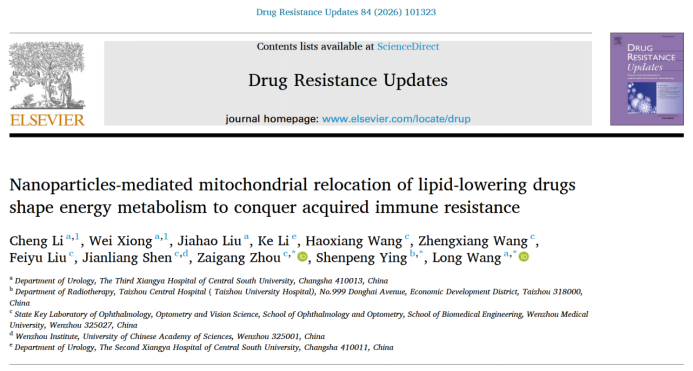 近日,国际顶级期刊《耐药性更新(Drug Resistance Updates,IF:21.7;中国科学院一区Top期刊)》在线发布了中南大学湘雅三医院泌尿外科王龙/熊伟团队题为“纳米颗粒介导的降脂药物线粒体重定位重塑能量代谢以克服获得性免疫耐药性(Nanoparticles-mediated Mitochondrial Relocation of Lipid-lowering Drugs Shape Energy Metabolism to Conquer Acquired Immune Resistance)”的原创性研究成果。