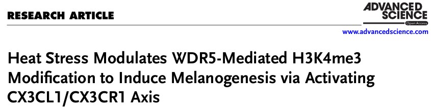 近期,中南大学湘雅三医院陈静、曾庆海课题组在“热黑现象”前期研究上取得新的突破,在《先进科学(Advanced Science,IF=14.1)》杂志发表了题为“热应激通过激活CX3CL1/CX3CR1轴调控WDR5介导的H3K4me3修饰诱导黑素生成(Heat Stress Modulates WDR5-Mediated H3K4me3 Modification to Induce Melanogenesis via Activating CX3CL1/CX3CR1 Axis)”的文章。该研究揭示了热应激具有通过调控组蛋白甲基化修饰进而激活黑素细胞功能的作用,并发现热应激可通过MYC-WDR5-H3K4me3轴上调CX3CL1表达,从而激活CX3CL1/CX3CR1信号通路,最终促进黑素生成的分子机制。