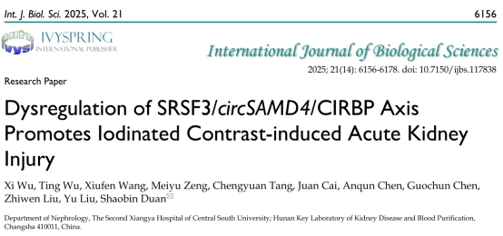 近日,中南大学湘雅二医院肾内科段绍斌教授课题组在国际知名期刊(International Journal of Biological Sciences) (中科院一区,IF:10.0)上发表了题为(Dysregulation of SRSF3/circSAMD4/CIRBP Axis Promotes Iodinated Contrast-induced Acute Kidney Injury)的原创研究论文,从表观遗传学角度解析了碘对比剂诱导的急性肾损伤发病新机制,并为其临床诊疗提供了新的靶点。