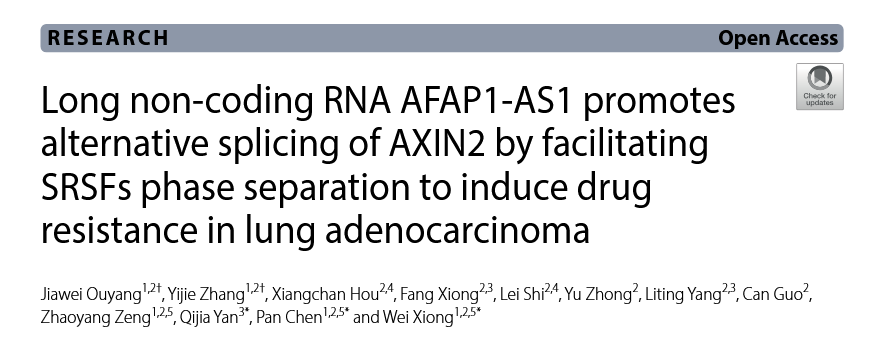 陈攀团队发表“长链非编码RNA AFAP1-AS1 通过促进 SRSFs相分离,增强 AXIN2 的可变剪接,从而诱导肺腺癌耐药”的研究成果