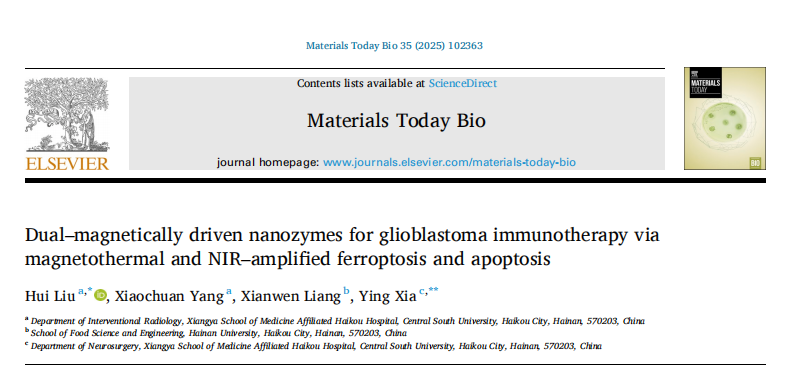 近日,中南大学湘雅学院附属海口医院介入医学科刘辉教授及神经外科夏鹰教授团队,在国际顶级期刊Materials Today Bio(IF: 10.2,中科院一区Top期刊)上发表原创论著《Dual–magnetically driven nanozymes for glioblastoma immunotherapy viamagnetothermal and NIR–amplified ferroptosis and apoptosis》,这项研究为开发整合靶向递送与多模态治疗的下一代胶质母细胞瘤纳米平台奠定了坚实基础。