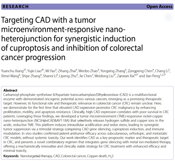 近日,中南大学湘雅医院与生命科学学院联合研究团队在国际知名学术期刊《Journal of Nanobiotechnology》(纳米生物技术杂志)(中科院1区,IF=12.6)在线发表题为“Targeting CAD with a tumor microenvironment-responsive nano-heterojunction for synergistic induction of cuproptosis and inhibition of colorectal cancer progression(构建肿瘤微环境响应型纳米异质结靶向CAD协同诱导铜死亡抑制结直肠癌进展)”的原创性研究论文。该研究首次系统揭示了CAD蛋白在结直肠癌中的关键促癌作用,并创新性构建了一种肿瘤微环境响应型镍铜纳米复合载体,为结直肠癌的精准治疗提供了全新策略。