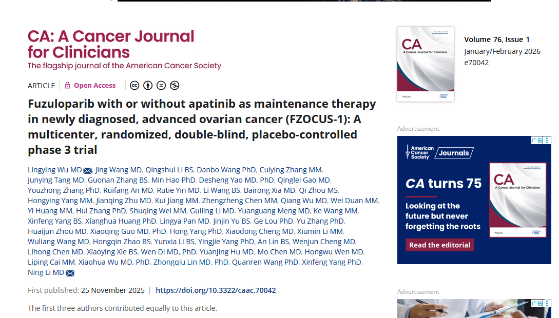 近日,湘雅医学院附属肿瘤医院王静教授在国际顶刊《CA: A Cancer Journal for Clinicians》(中科院一区,TOP期刊,2024IF=232.4)上发表题为“Fuzuloparib with or without apatinib as maintenance therapy in newly diagnosed, advanced ovarian cancer (FZOCUS‐1): A multicenter, randomized, double‐blind, placebo‐controlled phase 3 trial(以阿帕替尼联合或不联合氟唑帕尼作为维持治疗的新诊断晚期卵巢癌(FZOCUS-1)患者:一项多中心、随机、双盲、安慰剂对照的3期试验)的研究成果。