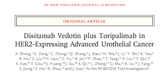 近日,湘雅医学院附属肿瘤医院蒋书算团队、曾恭谦副主任医师作为共同第一作者在国际顶级医学期刊《The NEW ENGLAND JOURNAL of MEDICINE》(中科院一区,TOP期刊,2024IF=78.5)上发表了题为"Disitamab Vedotin plus Toripalimab in HER2-Expressing Advanced UrothelialCancer(维迪西妥单抗联合特瑞普利单抗在 HER2 表达的局部晚期或转移性尿路上皮癌治疗)”的研究成果。