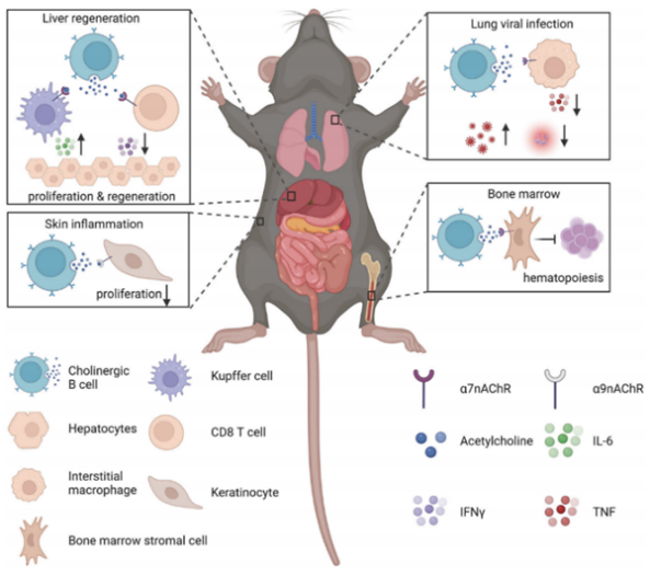 在Cellular & Molecular Immunology《细胞与分子免疫学》(中科院一区Top期刊,IF=19.8)发表了题为 “Cholinergic B cells: New players in immune regulation and tissue homeostasis”(胆碱能B细胞:免疫调控与组织稳态维持中的新成员)的论文。研究聚焦一种新发现的免疫细胞亚群-胆碱能B细胞(Cholinergic B cells),揭示其在免疫调控和组织稳态维持中的关键作用,为开发靶向胆碱能B细胞或其受体的新型抗炎和免疫调节药物提供了重要科学依据。