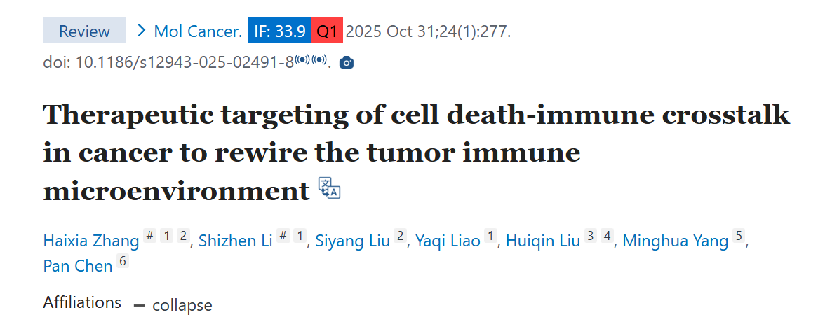 陈攀、刘慧琴团队在国际权威期刊《Molecular Cancer》发表综述,阐述细胞死亡-免疫应答的双向调控机制