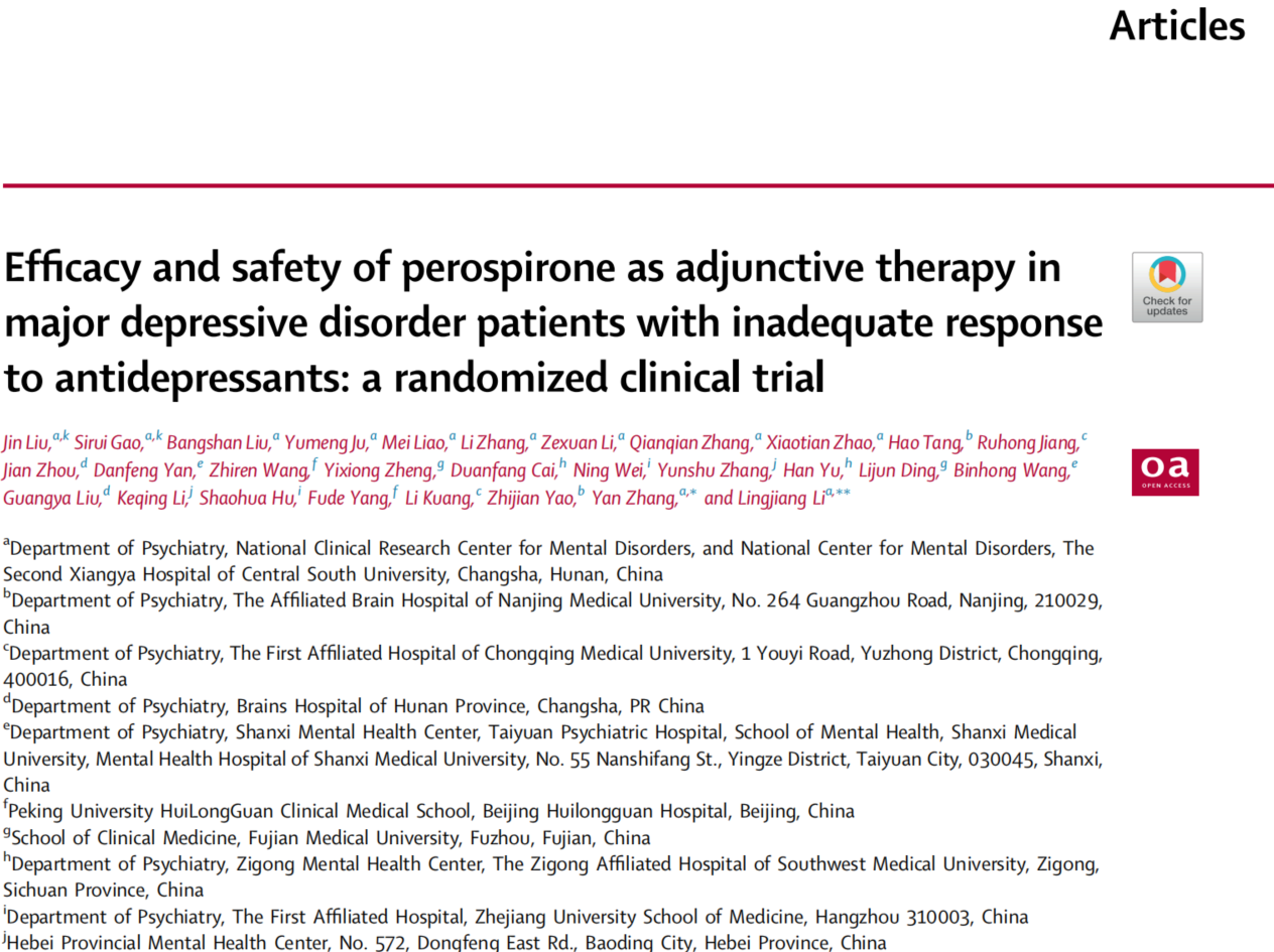 近日,中南大学湘雅二医院精神病学科李凌江教授、张燕教授团队在柳叶刀子刊《eClinicalMedicine》(影响因子:10)发表了题为“Efficacy and safety of perospirone as adjunctive therapy in major depressive disorder patients with inadequate response to antidepressants: a randomized clinical trial”(“哌罗匹隆作为增效治疗用于抗抑郁药疗效不佳的抑郁症患者:一项随机临床试验”)的原创性论著。该研究是首个评估哌罗匹隆用于此类患者的随机对照试验。