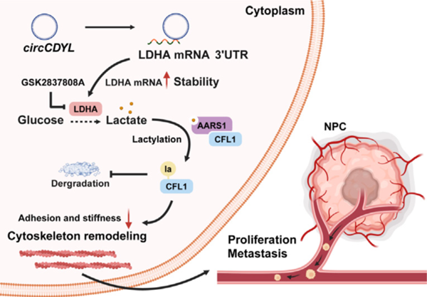 在Journal of Advanced Research杂志上(IF值:13.0),团队发表了题为“CircCDYL promotes glycolysis to drive the progression of nasopharyngeal carcinoma”(circCDYL促进糖酵解驱动鼻咽癌进展)的原创论文,发现环状RNA circCDYL通过结合并稳定代谢关键酶LDHA mRNA,从而上调LDHA表达,促进鼻咽癌细胞的糖酵解以及增殖和转移。