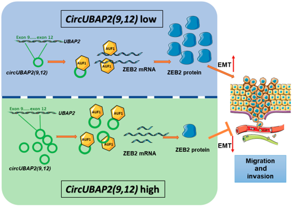 在Research杂志上(IF值:10.9),团队发表了题为“CircUBAP2(9,12) inhibits nasopharyngeal carcinoma invasion and metastasis by down-regulating ZEB2 through competitive binding to AUF1”(CircUBAP2(9,12)通过竞争性结合AUF1下调ZEB2表达抑制鼻咽癌侵袭和转移)的原创论文。该研究发现AUF1蛋白可以结合并稳定ZEB2 mRNA使ZEB2维持高表达,鼻咽癌表现出较强的侵袭与转移能力;由UBAP2基因第9-12号外显子产生的一种新的环状RNA CircUBAP2(9,12)在鼻咽癌细胞中表达下调,如果恢复CircUBAP2(9,12)的表达,可以竞争性结合AUF1,从而下调ZEB2表达,抑制鼻咽癌侵袭和转移。
