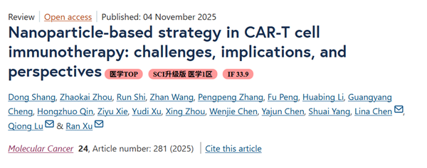 近日,湘雅二医院泌尿外科徐冉教授和药学部鲁琼教授课题组在《分子肿瘤学杂志》(Molecular Cancer)(中科院一区,IF=33.9)在线发表了题为《基于纳米颗粒的CAR-T细胞免疫治疗策略:挑战、意义和前景》(Nanoparticle-Based Strategy in CAR-T Cell Immunotherapy: Challenges, Implications, and Perspectives)的论文,揭示了基于纳米材料的CAR-T细胞免疫治疗策略的未来前景。