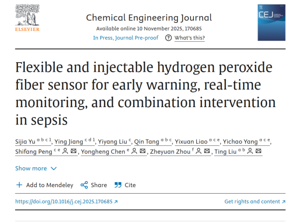 近日,中南大学湘雅医院消化内科博士生导师刘霆教授团队,联合彭仕芳教授和陈永恒教授团队,在国际期刊Chemical Engineering Journal(IF: 13.2)上发表了题为“Flexible and Injectable Hydrogen Peroxide Fiber Sensor for Early Warning, Real-Time Monitoring, and Combination Intervention in Sepsis” 的研究论文。本研究针对脓毒症早期诊断和治疗干预存在的滞后性与局限性问题,创新性地提出并构建了一种柔性可注射过氧化氢纤维传感器(HPFS),可实现对体内过氧化氢的动态实时监测及抗氧化治疗的闭环干预。该传感器具备优异的柔韧性、电化学灵敏性与组织相容性,能够通过微创方式注射植入体内。在动物模型中,HPFS可在脓毒症发作1–2小时内检测到H₂O₂水平升高,优于传统炎症标志物,表现出显著的早期预警能力。通过HPFS进行抗氧化治疗实现了对内源性H₂O₂浓度的实时调控,从而减轻肺组织损伤并提高存活率,展示了HPFS在脓毒症及其他炎症类疾病中的广阔应用前景。