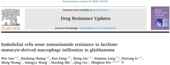 近日,湘雅基础医学院/芙蓉实验室高伟博士/武明花教授在Drug Resistance Updates(IF=23)杂志在线发表最新成果Endothelial cells sense temozolomide resistance to facilitate monocyte-derived macrophage infiltration in glioblastoma研究论文,揭示了替莫唑胺耐药通过破坏内皮屏障功能促进胶质母细胞瘤单核细胞来源的巨噬细胞浸润的机制,该研究将化疗耐药性与血管和免疫重塑联系起来,为复发胶质母细胞瘤提供了靶向治疗新策略。