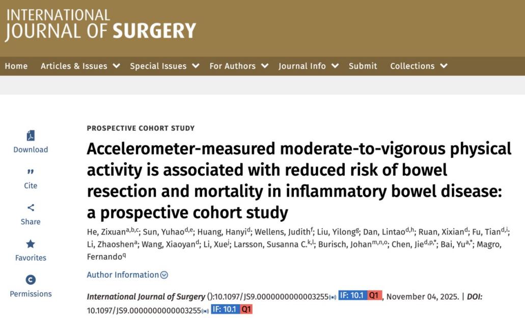 近日,中南大学湘雅三医院消化内科王晓艳教授/陈杰副教授团队携手海军军医大学长海医院柏愚教授团队于国际外科学权威期刊《International Journal of Surgery》(国际外科学杂志,IF=10.1) 发表原创性研究论文《Accelerometer-measured moderate-to-vigorous physical activity is associated with reduced risk of bowel resection and mortality in inflammatory bowel disease: a prospective cohort study》(加速度计测量的中度至剧烈体力活动与炎症性肠病患者肠切除风险和死亡率的降低有关:一项前瞻性队列研究),首次系统揭示了加速度计客观测量的中高强度体力活动对炎症性肠病(IBD)预后的作用,为IBD的运动干预提供了高质量证据。