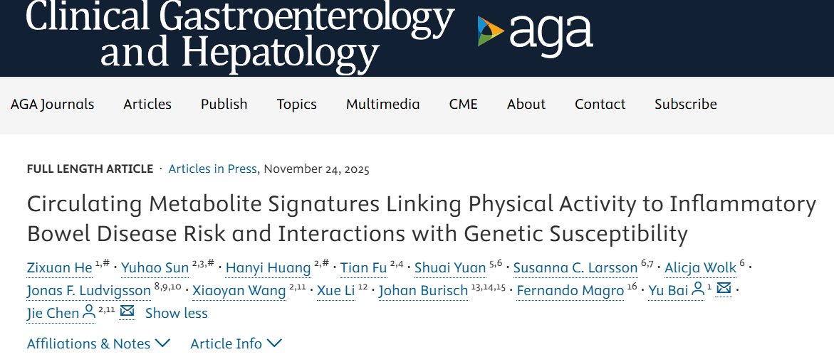 近日,中南大学湘雅三医院消化内科王晓艳教授/陈杰副教授团队携手海军军医大学长海医院柏愚教授团队在国际权威期刊《临床胃肠病学和肝脏病学(Clinical Gastroenterology and Hepatology,IF=12.0,中科院一区Top)》发表原创性研究论著《代谢图谱揭示体力活动与炎症性肠病风险的关联及其与遗传易感性的交互作用(Circulating Metabolite Signatures Linking Physical Activity to Inflammatory Bowel Disease Risk and Interactions with Genetic Susceptibility)》。首次从代谢组学层面系统阐明中高强度运动(MVPA)降低炎症性肠病(IBD)风险的可能生物学途径,为IBD高危人群的精准预防提供了新方向。