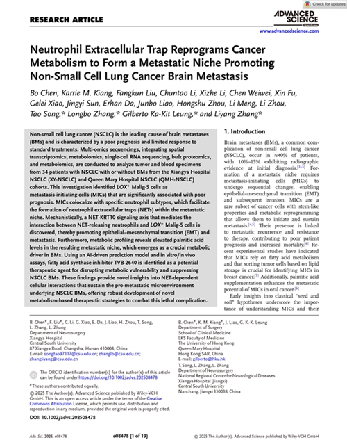 近日,中南大学湘雅医院、湘雅医院江西医院(国家神经疾病区域医疗中心)宋涛教授、张李洋副教授、张隆伯教授团队与香港大学、中山大学合作,在国际知名期刊《Advanced Science》(《先进科学》,IF=14.1)上,在线发表了非小细胞肺癌脑转移相关研究成果。