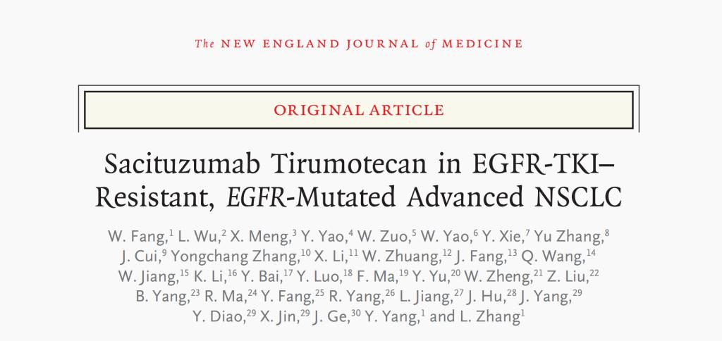 近日,湘雅医学院附属肿瘤医院邬麟教授在国际顶级医学期刊《The NEW ENGLAND JOURNAL of MEDICINE》(中科院一区,TOP期刊,2024IF=78.5)主刊发表了一篇题为“Sacituzumab Tirumotecan in EGFR-TKI-Resistant, EGFR-Mutated Advanced NSCLC”[芦康沙妥珠单抗(sac-TMT)治疗EGFR-TKI耐药、EGFR突变晚期NSCLC的III期研究(OptiTROP-Lung04)]的研究成果。该研究证实了Trop-2靶向ADC药物在EGFR突变耐药NSCLC中的显著生存获益,成为首个在EGFR-TKI进展后单药治疗带来明确获益的治疗选择,展现出在化疗前序贯应用的强大竞争力。