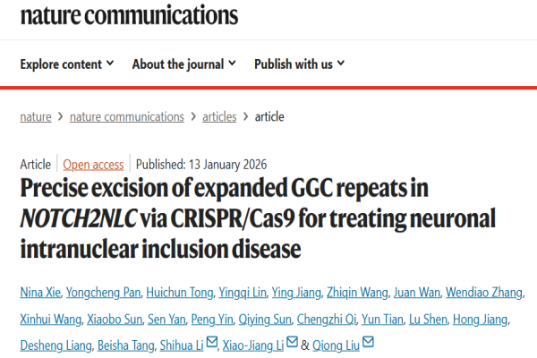 唐北沙/刘琼团队与暨南大学李晓江、李世华团队合作,在《Nature Communications》上以论著形式在线发表了题为“Precise excision of expanded GGC repeats in NOTCH2NLC via CRISPR/Cas9 for treating neuronal intranuclear inclusion disease”的原创性研究成果,首次成功实现了对NIID致病突变的精准切除和修复。该研究运用CRISPR/Cas9基因编辑系统,靶向GGC重复序列侧翼特定区域,通过双sgRNA协同作用成功实现了对NOTCH2NLC基因GGC重复序列的高效、特异性切除,并通过同源定向修复技术将其校正至生理正常长度。该编辑策略的有效性、特异性及安全性,在患者来源的IPSC、NPC及转基因小鼠模型中得到了系统性验证,为后续临床转化奠定了坚实基础。