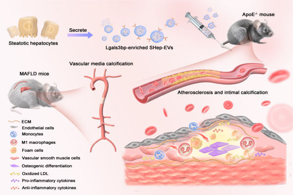 发表于《先进科学》(IF=14.1)的研究,聚焦代谢性脂肪肝病与血管钙化的临床关联。团队成员与曾召林博士(内分泌专业)、刘江华教授(内分泌科)、祖旭宇教授(肿瘤学科)合作,跨界探索发现,病变肝脏分泌的特异性囊泡可作为信使,直接促进动脉粥样硬化与钙化进程。这一发现深化了对器官间“远程病理通讯”的理解,为防治相关血管并发症开辟了新方向。
