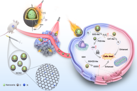 发表于《先进医疗材料》(IF=9.6)的研究,针对肿瘤催化治疗的选择性难题,团队成员刘宏基助理研究员(材料物理与化学专业)等与王辉研究员(中国科学院合肥物质科学研究院强磁场实验室)合作,借鉴材料学“空间限域”理念,设计出具有核壳结构的纳米酶。该催化剂能在近红外激光精准激活下,于肿瘤部位高效产生治疗物质,同时保护正常组织,显著提升了治疗的安全性,展现了纳米酶技术的临床转化前景。