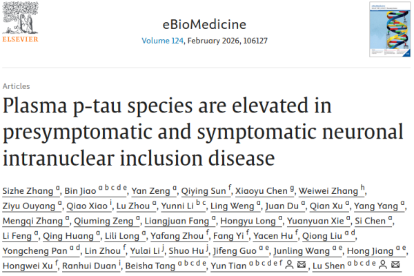 沈璐团队在Lancet子刊《eBioMedicine》上以论著形式在线发表了题为《Plasma p-tau species are elevated in presymptomatic and symptomatic neuronal intranuclear inclusion disease》的原创性研究成果,揭示了NIID存在tau病理改变,扩展了tau蛋白谱系疾病。该研究纳入NIID患者和症状前个体2个队列,通过对多队列人群的外周血生物标志物分析,发现NIID患者中p-tau217、p-tau231、p-tau181、α-syn、NfL及GFAP等多种生物标志物水平显著升高,其中p-tau217能有效区分NIID患者与健康对照,但难以鉴别NIID与阿尔茨海默病(AD),提示两者在tau病理上可能存在重叠。