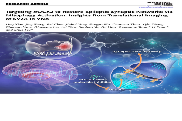 另一项发表于《Advanced Science》的研究(题为Targeting ROCK2 to restore epileptic synaptic networks via mitophagy activation: insights from translational imaging of SV2A in vivo)聚焦颞叶癫痫突触网络重塑及其靶向干预机制。研究团队利用靶向SV2A的[18F]SynVesT-1 PET成像,刻画了颞叶癫痫患者突触网络的异常重塑特征。结合PET成像与转录组学分析,研究进一步鉴定了突触网络重塑的关键调控基因ROCK2。动物实验结果提示,ROCK2抑制剂可通过激活线粒体自噬,改善突触密度和突触网络效率,并降低癫痫发作强度与频率,改善认知功能。该研究为颞叶癫痫突触层面的机制解析及靶向治疗策略提供了重要实验依据。