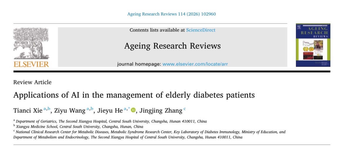 近日,中南大学湘雅二医院张晶晶、贺洁宇课题组在老年医学领域权威期刊《Ageing Research Reviews》(老年医学领域TOP 3,IF 12.4)发表综述论文,题为“Applications of AI in the management of elderly diabetes patients” 。该论文研究了AI在老年糖尿病管理中的创新应用,系统整理了AI技术在老年糖尿病疾病筛查、诊断监测、治疗干预等全阶段的研究进展,为解决老年糖尿病患者管理问题提供了全新思路与科学支撑。