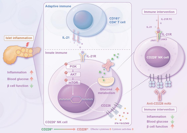 在团队前期发现致病性T细胞新亚群并阐明其介导1型糖尿病(T1D)进展与缓解机制的研究基础上,本研究进一步将视角拓展至先天免疫系统,系统解析了 CD161⁺CD4⁺ T细胞–IL-21–CD226⁺ NK细胞轴在T1D缓解过程中的关键作用。研究首次提出“辅助性T细胞—自然杀伤细胞轴向互作”的免疫调控模式,为深入理解T1D发病机制及探索靶向干预策略提供了新的思路与理论依据。