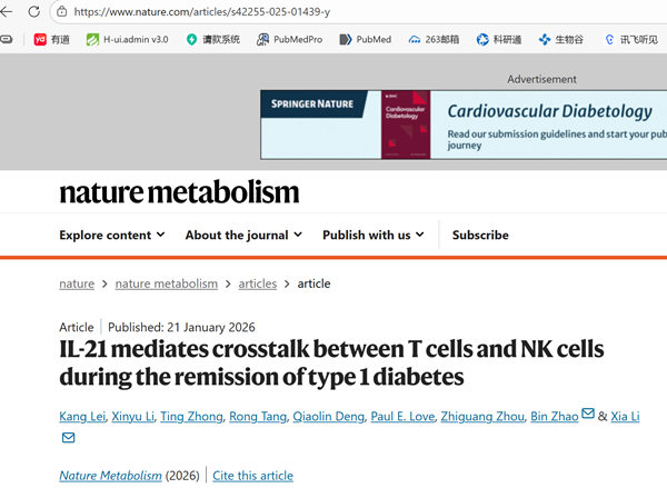 近日,中南大学湘雅二医院内分泌与代谢性疾病国家临床医学研究中心李霞教授与赵斌教授团队在代谢领域权威期刊《自然·代谢》(Nature Metabolism,IF=20.8)发表研究论文《IL-21介导的T细胞与NK细胞在1型糖尿病缓解期的相互作用机制》(IL-21 mediates crosstalk between T cells and NK cells during the remission of type 1 diabetes),揭示了1型糖尿病缓解期关键免疫互作机制。