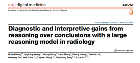 近日,中南大学湘雅二医院放射科主任刘军教授课题组在《数字医学》(npj Digital Medicine,影响因子15.1)发表了题为《通过大型推理模型对结论进行推理在放射学中的诊断与解释收益》(Diagnostic and interpretive gains from reasoning over conclusions with a large reasoning model in radiology)的研究性论文。