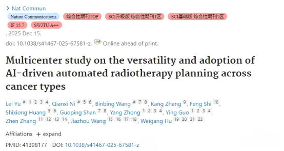 近日,由湘雅医学院附属肿瘤医院倪千喜教授作为共同第一作者在自然子刊《Nature Communications》(中科院一区TOP期刊,2024IF=15.7)发表了题为“Multicenter study on the versatility and adoption of AI-driven automated radiotherapy planning across cancer types(人工智能驱动的自动化放疗计划在各类癌症中的通用性与应用多中心研究)”的原创性研究论文。