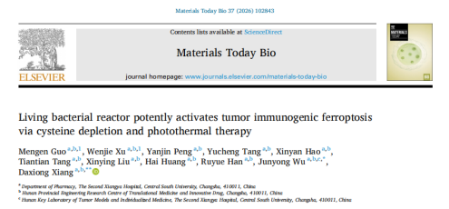 其中关于三阴性乳腺癌(TNBC)的研究发表在《Materials Today Bio》上。研究团队开发了一种名为A-SPB的非基因工程活性细菌反应器。该系统利用希瓦氏菌(SO)对缺氧肿瘤微环境的趋化性,通过主动耗竭半胱氨酸(Cysteine)来切断谷胱甘肽(GSH)合成路径,并产生硫化氢阻断代谢旁路,从而触发强效的肿瘤免疫原性铁死亡。此外,表面修饰的普鲁士蓝纳米粒子不仅增强了光热治疗效果,还充当了“生物开关”,在清除肿瘤的同时诱导细菌自裂解以确保生物安全性,并激活全身抗肿瘤免疫反应。