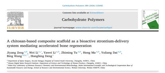 近日,中南大学湘雅二医院脊柱外科王冰教授课题组在国际顶尖期刊《Carbohydrate Polymers》(自然指数期刊,中科院一区Top,IF:12.5)上发表了基于壳聚糖的复合支架作为生物活性锶递送系统介导加速骨再生的研究成果。课题组基于临床重大问题的探索及医工交叉研究,成功研发了一种新型的骨修复材料(CS/SF@SrAlg),这一创新成果为骨缺损修复提供了全新的治疗策略。