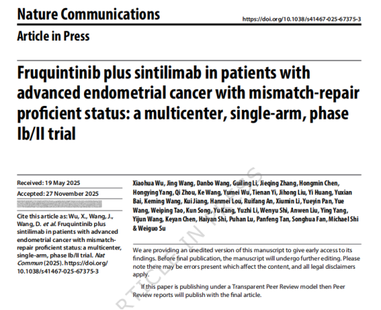 近日,由复旦大学附属肿瘤医院吴小华教授、中南大学湘雅医学院附属肿瘤医院王静教授等领衔的多中心研究团队在国际知名学术期刊《Nature Communications》(中科院一区TOP期刊,2024IF=15.7)上发表了题为“Fruquintinib plus sintilimab in patients with advanced endometrial cancer with mismatch-repair proficient status: a multicenter, single-arm, phase Ib/II trial(呋喹替尼联合信迪利单抗治疗错配修复功能完整型晚期子宫内膜癌的多中心、单臂Ib/II期临床试验)”的重要研究成果。该研究首次系统评估了国产创新药呋喹替尼联合信迪利单抗在经治的错配修复功能完整(pMMR)型晚期子宫内膜癌患者中的疗效与安全性,填补了该领域在中国的治疗空白。