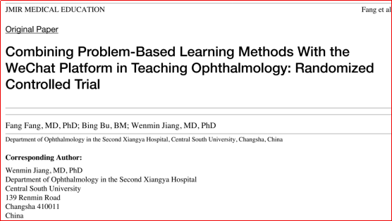 近日,湘雅二医院眼科方芳、姜文敏在JMIR Medical education(JCR1区,IF:12.6)上发表“Combining Problem-Based Learning Methods With the WeChat Platform in Teaching Ophthalmology: Randomized Controlled Trial”文章。该研究以队列研究形式探讨了眼科本科教学(Problem based learning, PBL)联合中国特色的微信平台交流方法,与传统课堂教学的比较,对于眼科本科生教学质量与评估提供了创新方法与理论。中南大学湘雅二医院为论文的第一作者和通讯作者单位,姜文敏主任医师为论文的独立通讯作者,方芳副研究员为独立第一作者。