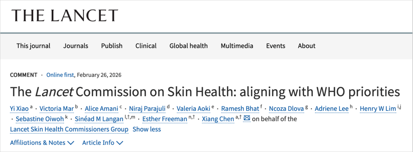 《The Lancet》借此契机宣布成立首个皮肤健康委员会,该委员会由中南大学湘雅医院牵头,联合全球多个大洲的皮肤病学、疾病负担、流行病学及实施科学等多领域的学者与专家共同开展,是全球皮肤健康领域率先开展的高层次学术行动。